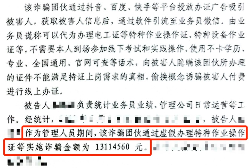 公安机关查明:潘凡等人通过抖音、百度、快手等平台投放办证广告吸引被害人,获取被害人信息后,通过软件引流至业务员微信。由业务员谎称可以代为办理电工证、高空作业证等特种作业操作证、特种设备作业证等,不需要本人到场参加线下考试和实践操作,使用不卡学历专业、全国通用、官网可查等话术,向被害人隐瞒该团伙所办理的证件不能满足持证上岗需求的真相,偷换概念诱骗被害人付衰进行线上办证。