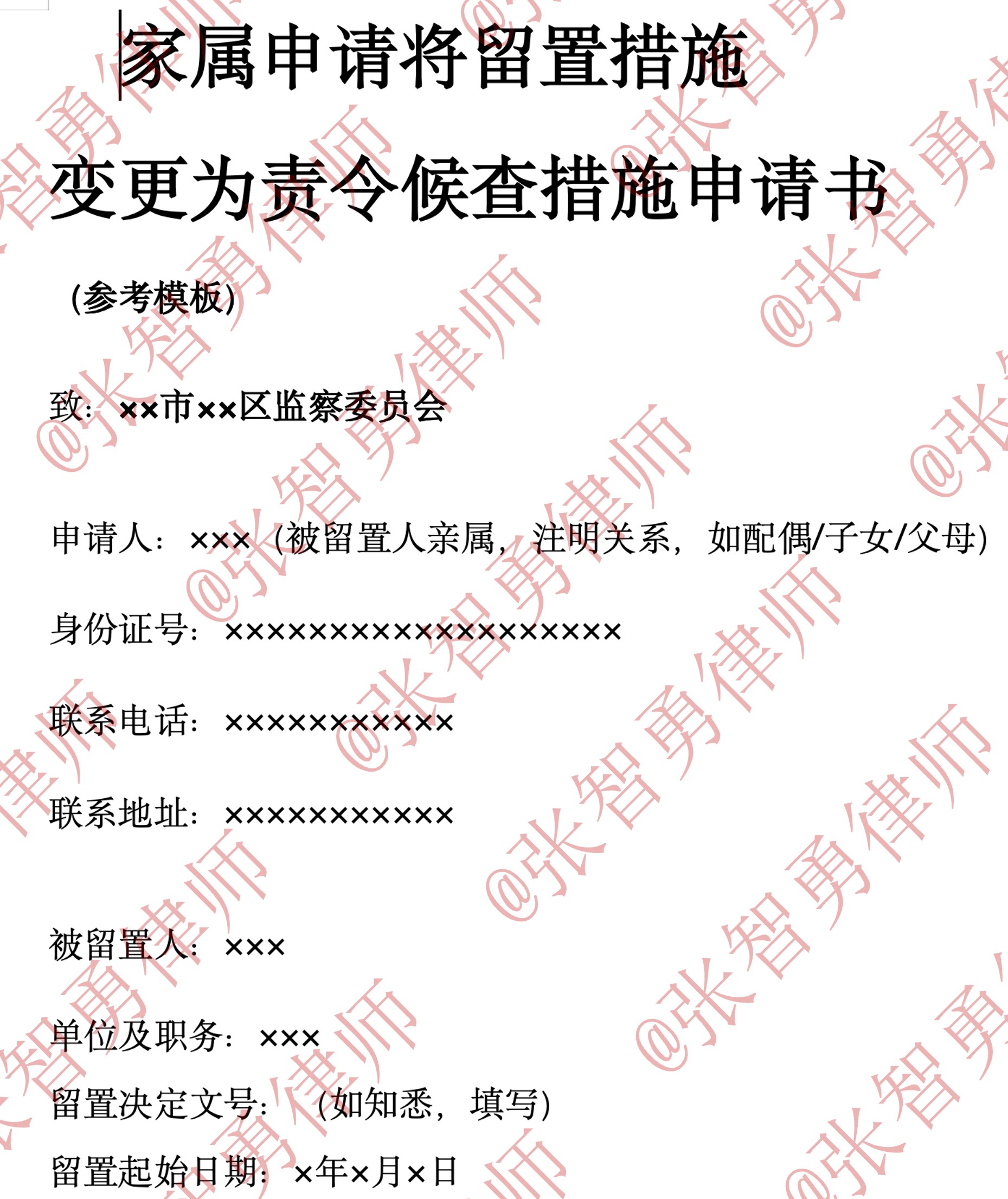 致:××省××市××区监察委员会申请人:×××(与被留置人关系)