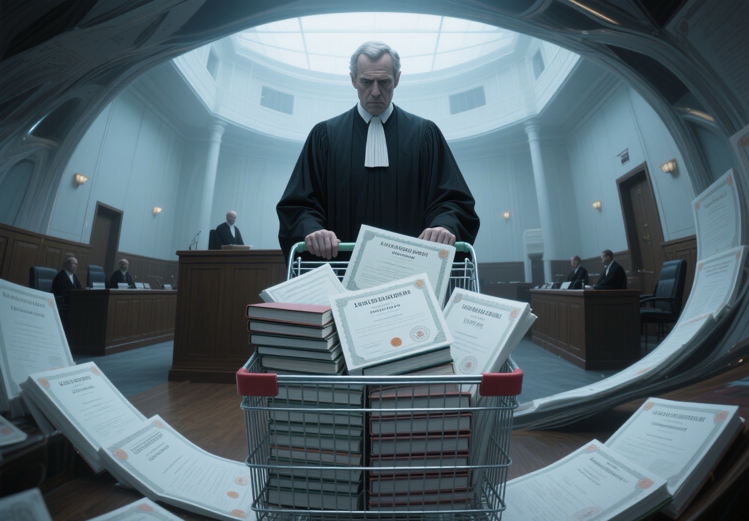 前段时间,办了一件关于学历证书的诈骗案子,从早到晚开了一天的庭,这个案件光证据有四十多本,为此,法官还专门拿了一个超市的购物推车来装这些证据材料。