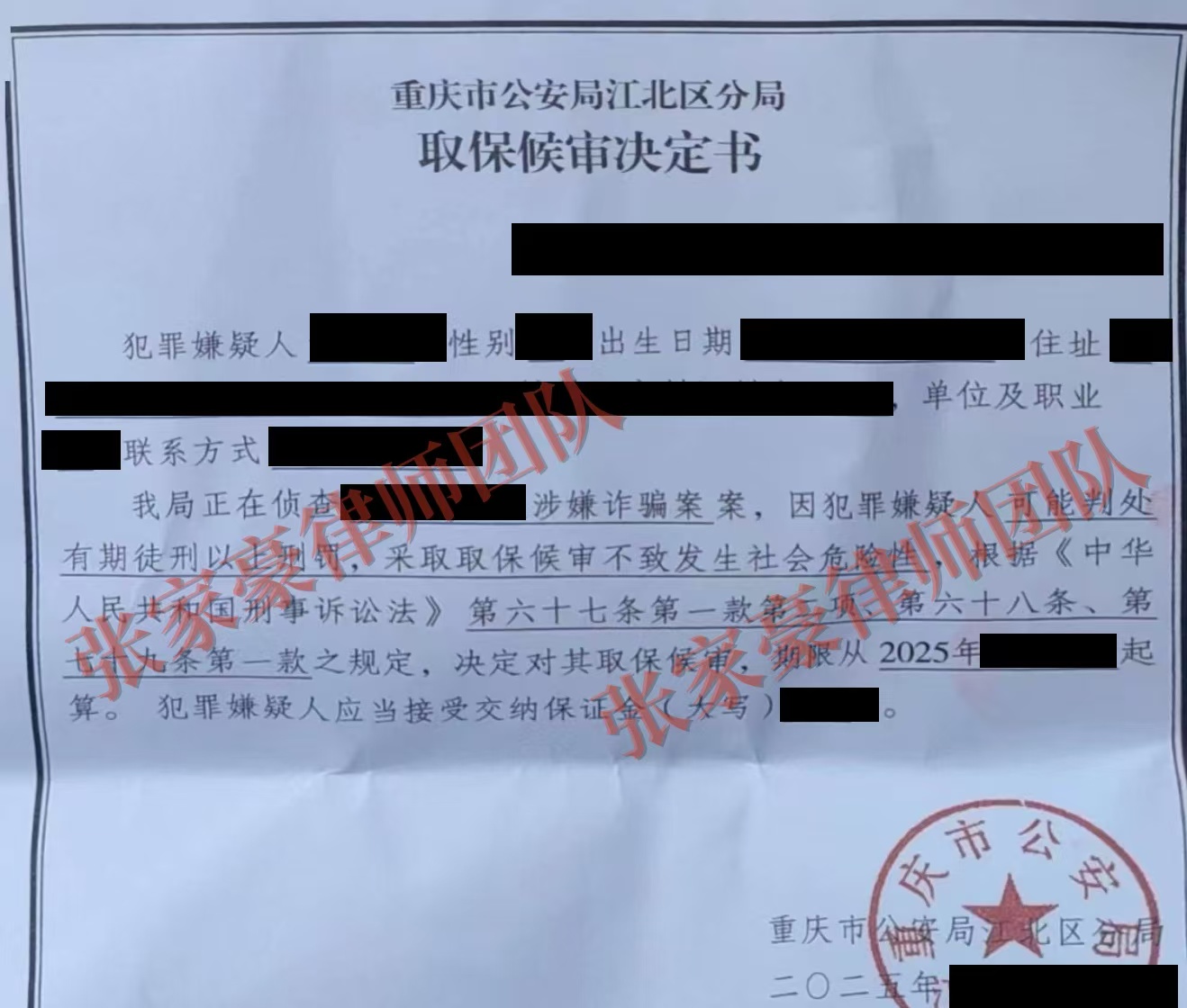 案情简介:重庆江北区侦办了一起“烧香诈骗”案件,当事人因代理身份涉案,以诈骗罪被刑事立案。张家豪律师团队在案件侦查阶段及时介入,经多方努力,最终当事人成功取保候审。