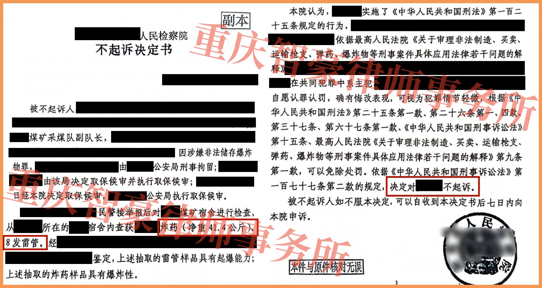 案情简介:当事人因煤矿宿舍内查出41.4公斤炸药和8枚雷管,被以涉嫌非法储存爆炸物刑拘,案件一度面临十年以上重刑。重庆智豪律师事务所介入辩护,仅用一个月成功取保候审,并最终推动检察机关作出不起诉决定。
