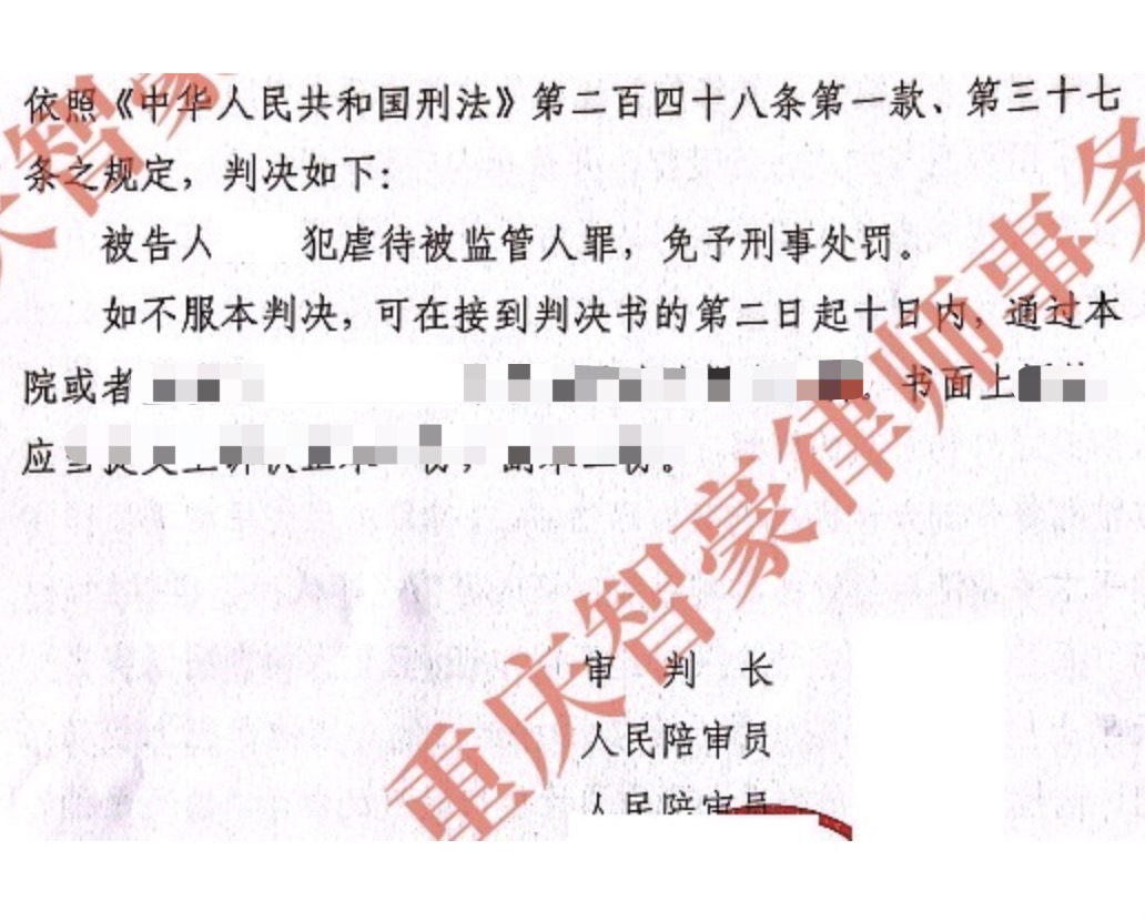 一场监狱内矛盾处理失当,引发一桩官司。被监管人员左腿骨折,被鉴定为轻伤一级。公诉机关以“虐待被监管人罪”起诉。张智勇律师团队介入后,从“伤因不唯一、动机非虐待、矛盾已化解、危害性不高”四个方面发力,最终法院判处免予刑事处罚。